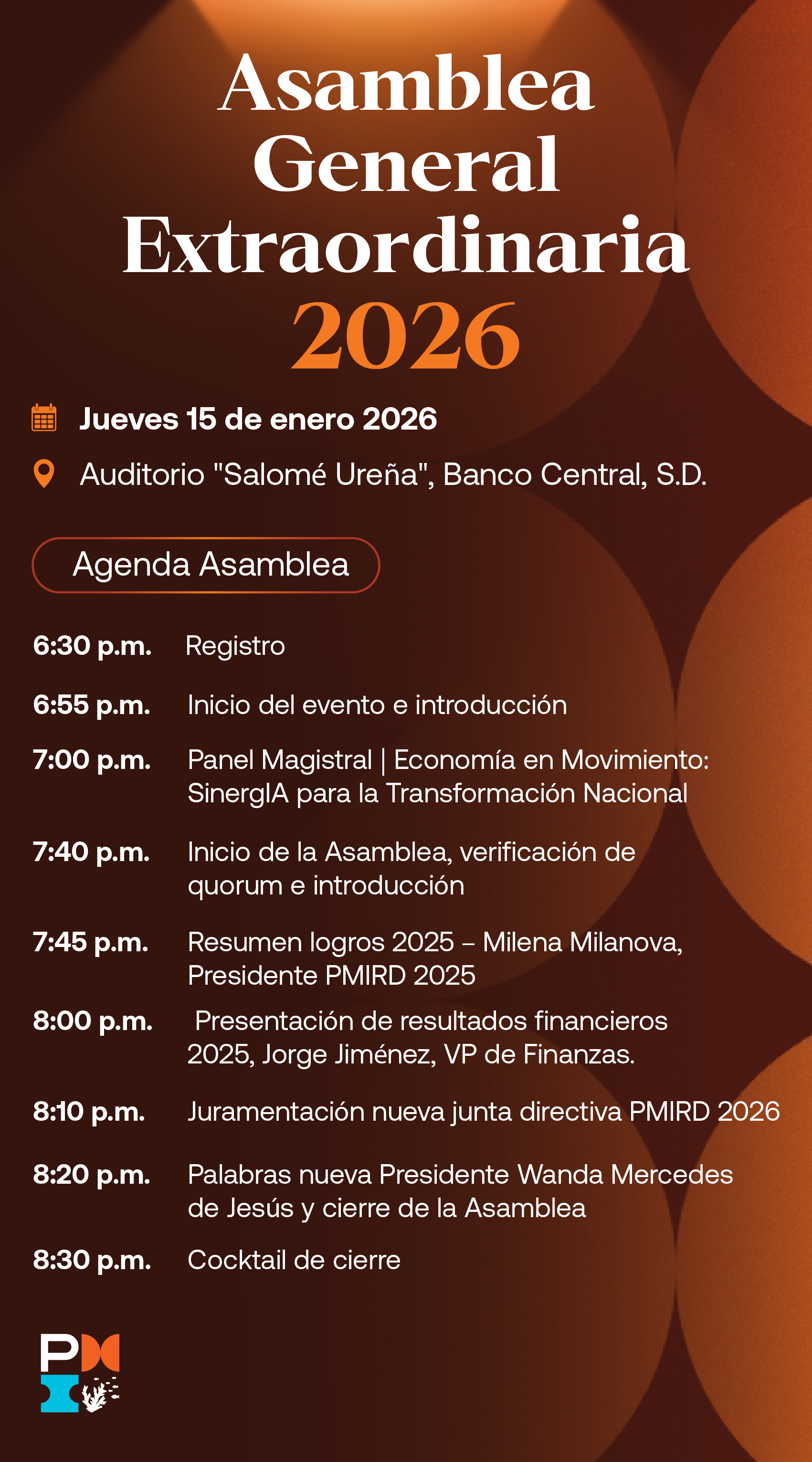 El PMI Capítulo República Dominicana, te invita cordialmente a nuestra Asamblea General Extraordinaria de Miembros, a ser celebrada el Jueves 15 de enero del año 2026 a partir de las s 6:30 p. m. en modalidad presencial desde el Auditorio Salomé Ureña del Banco Central, ubicado en la Calle Manuel Rodríguez Objío, Santo Domingo, y con transmisión en vivo vía Zoom.